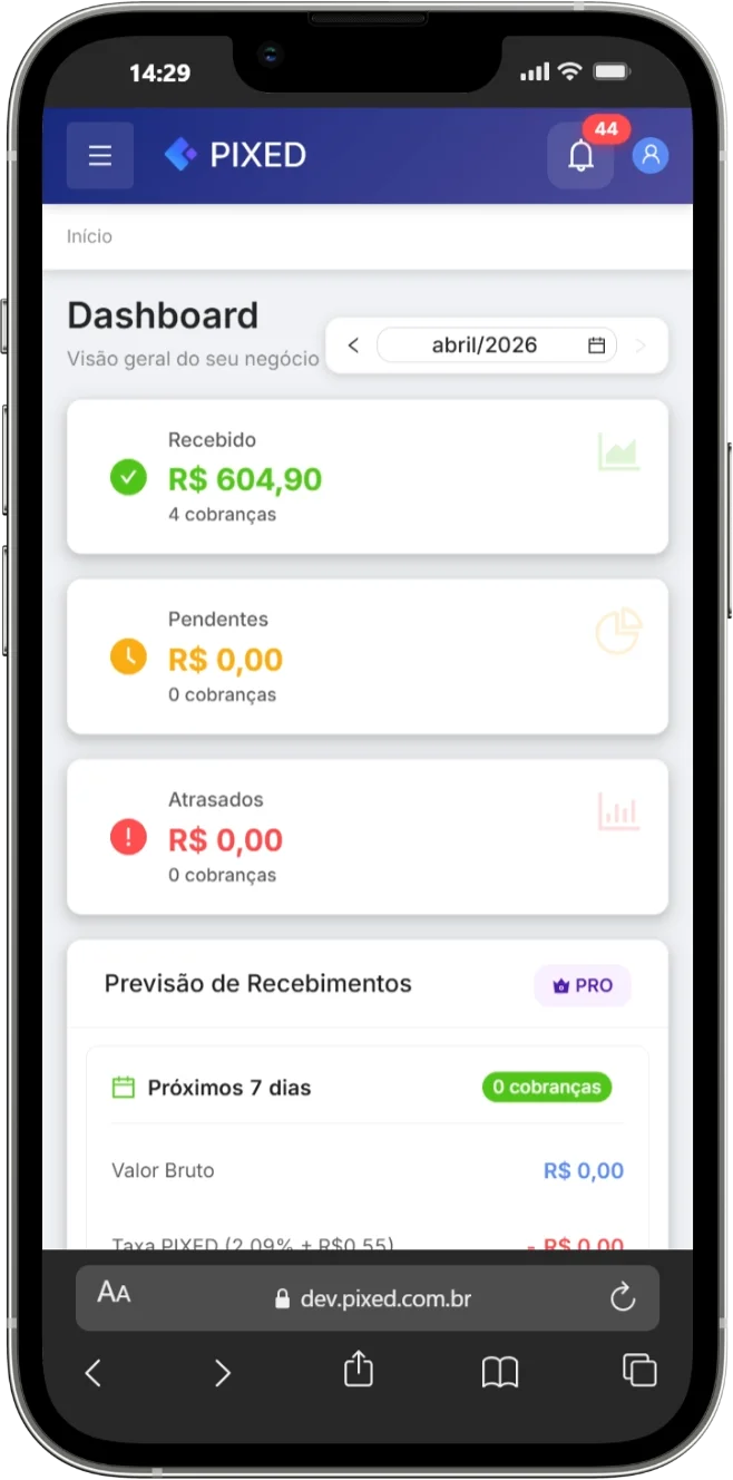 Essa taxa é descontada automaticamente apenas quando você recebe um pagamento. Se você cobrar R$ 100,00, receberá R$ 97,36 na sua conta virtual PIXED (plano Pro).